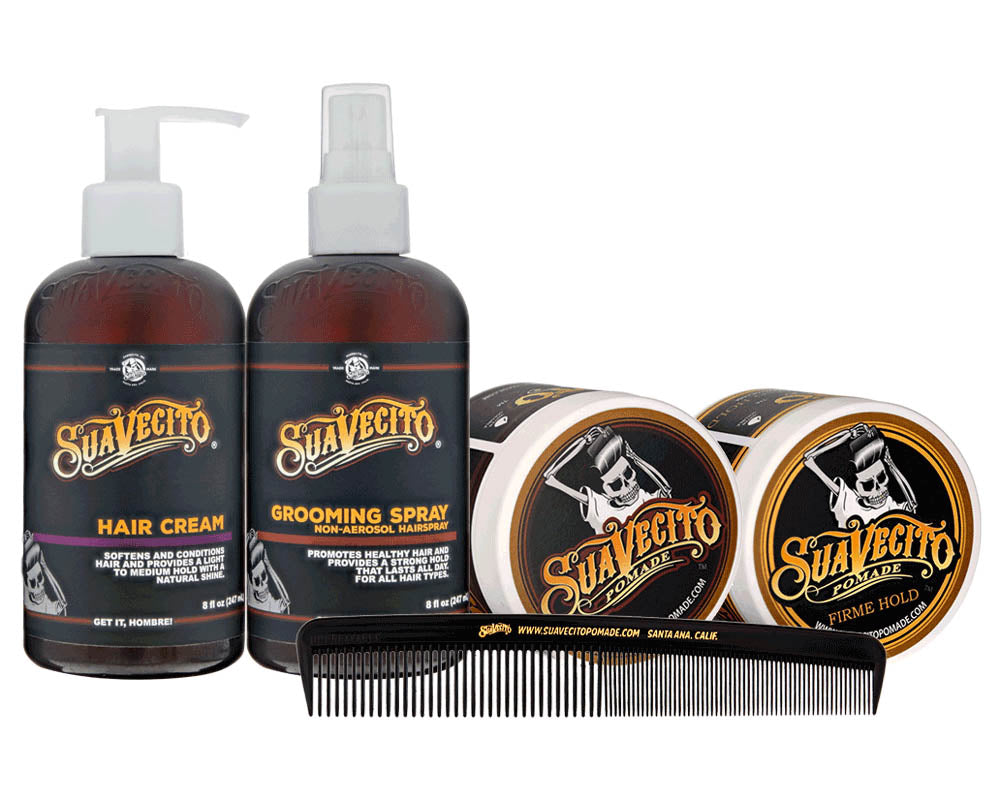 What more do you need in your life than the complete hair kit from Suavecito Pomade? Take charge of your day! Be ready to face any challenge knowing your hair is looking firme! Got a job interview lined up? No problem. Important meeting with the President? No Problem. First date? No Problem. Shooting your music video? No Problem. This kit includes all you need to style that mop, making it your masterpiece. Includes: two pomades, Grooming Spray, Hair Cream and a large deluxe comb.