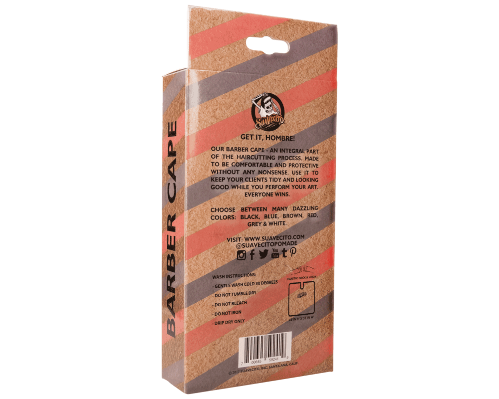 The Suavecito OG Script Barber Cape is made to be more durable and lightweight. Quality that will last you a whole lot longer. This perfectly designed accessory prevents pesky hairs sticking into the cape and into your clients while repelling hair for optimal client comfort. Material is 100% Polyester with a smooth and soft feel for comfort. The Suavecito logo is proudly printed on the front. The cape has an elastic neck & metal hooks for a perfect fit on each client.