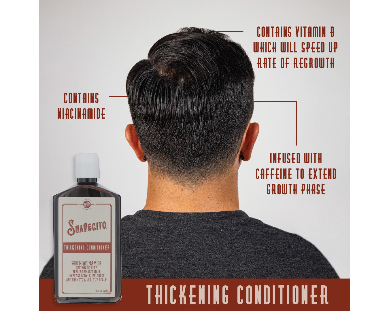 Our Thickening Conditioner contains niacinamide as well as other ingredients that are popular in hair loss shampoos for their hair growth benefits. Rosemary oil has been commonly used to promote hair growth similar to minoxidil. Biotin, also found in our Thickening Conditioner, is a form of Vitamin B. While there is little known about the effects of biotin on hair growth, a biotin deficiency is known to lead to hair loss, indicating it is important to your hair health. Our formula is also infused with caffeine. It’s been shown to extend the growth phase of hair follicles and works well in combination with minoxidil and/or DHT blockers.